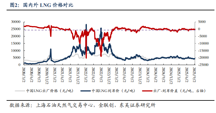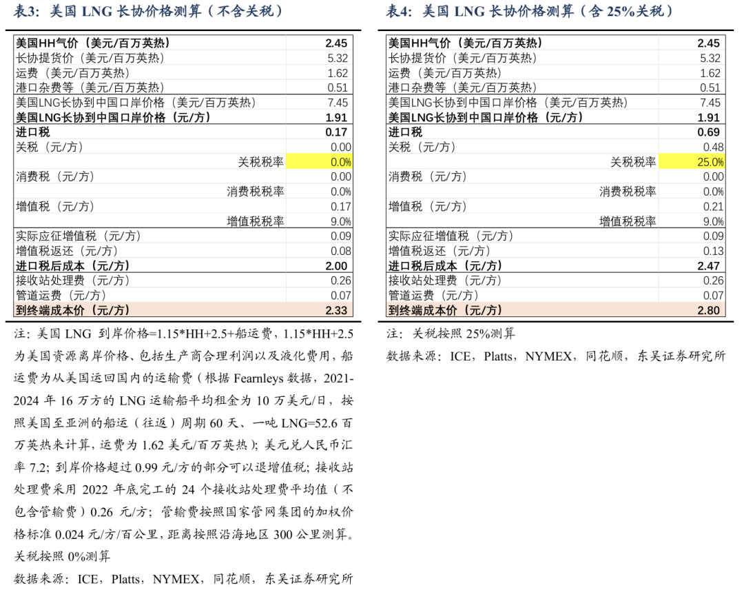 参考入库报告《自2/10起对美LNG加征15%关税,美LNG进口占比有限,加关税后仍具成本优势》,2024年美国LNG长协到达沿海地区终端用户的成本叠加25%关税将达2.80元/方,在沿海地区仍具0.08~0.55元/方的价格优势,价格优势显现。2024年中国自美国进口LNG约416万吨,占LNG进口总量约5.4%,占全国表观消费量约1.4%;占比较小,对整体供给影响有限。