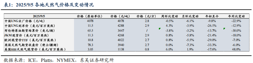 截至2025/09/05,美国HH/欧洲TTF/东亚JKM/中国LNG出厂/中国LNG到岸价周环比变动+6%/+0.8%/+0.8%/-0.5%/+4.3%至0.8/2.7/2.9/2.8/2.9元/方。
