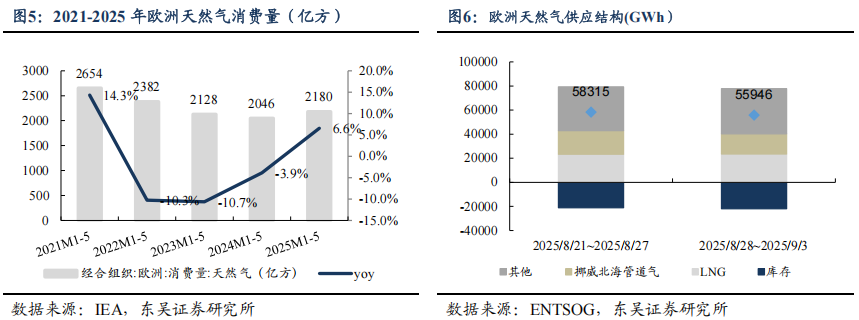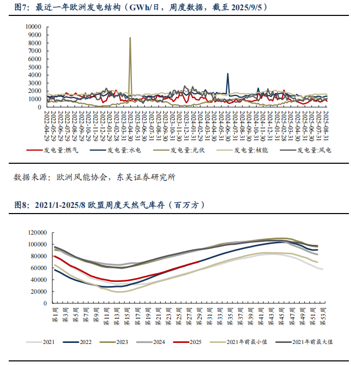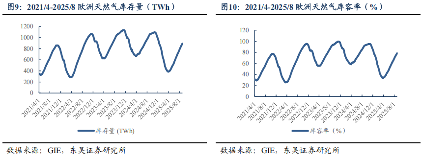 储库推进,欧洲气价周环比+0.8%。2025M1-5,欧洲天然气消费量为2180亿方,同比+6.6%。2025/8/28~2025/9/3,欧洲天然气供给周环比-4.1%至55946GWh;其中,来自库存消耗-21956GWh,周环比+4.2%;来自LNG接收站23469GWh,周环比+0.2%;来自挪威北海管道气16890GWh,周环比-13.7%。2025/08/30~2025/09/05,欧洲燃气发电出力下降,欧洲日平均燃气发电量周环比-22.2%、同比-32.3%至736.2GWh。截至2025/09/03,欧洲天然气库存893TWh(863亿方),同比-168TWh;库容率78.51%,同比-14.1pct,周环比+1.9pct。