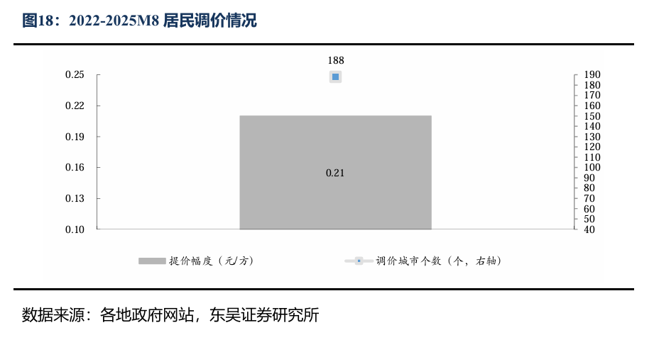 2022~2025M8,全国64%(187个)地级及以上城市进行了居民顺价,提价幅度为0.21元/方。2024年龙头城燃公司价差在0.53~0.54元/方,结合我们此前在报告《对比海外案例,国内顺价政策合理、价差待提升》中的测算,城燃配气费合理值在0.6元/方以上,价差仍存10%修复空间,顺价仍将继续落地。