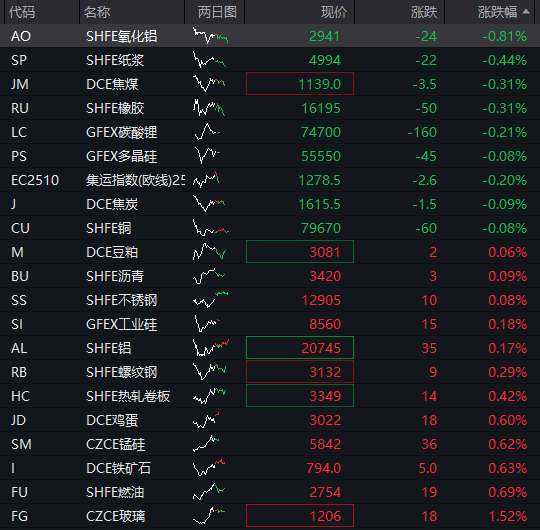 商品:国内商品期货分化,截至发稿,氧化铝、纸浆、焦煤、橡胶、碳酸锂、多晶硅、集运指数、焦炭、铜等走低,豆粕、沥青、不锈钢、工业硅、铝、螺纹钢、热卷板、鸡蛋、锰硅、铁矿石、燃油等小幅上涨,玻璃涨超1%。