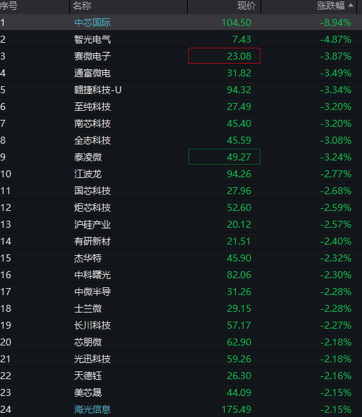 芯片股开盘走低,晶升股份跌超10%,中芯国际复牌跌超9%,通富微电、翱捷科技、佰维存储、盛美上海、至纯科技、全志科技、江波龙等跟跌。