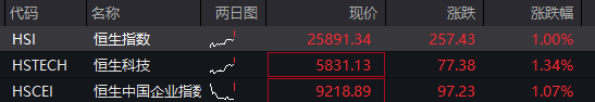 港股:截至发稿,恒指涨1.00%,恒科指涨1.34%。