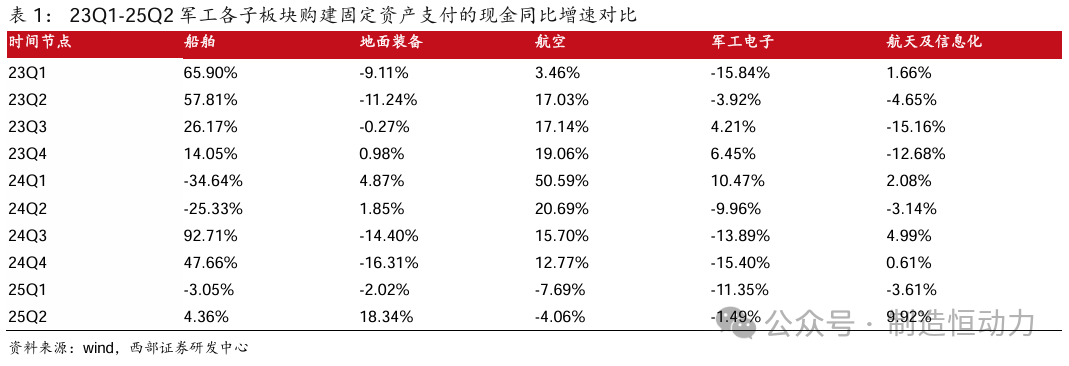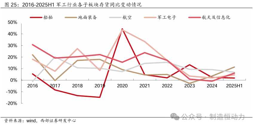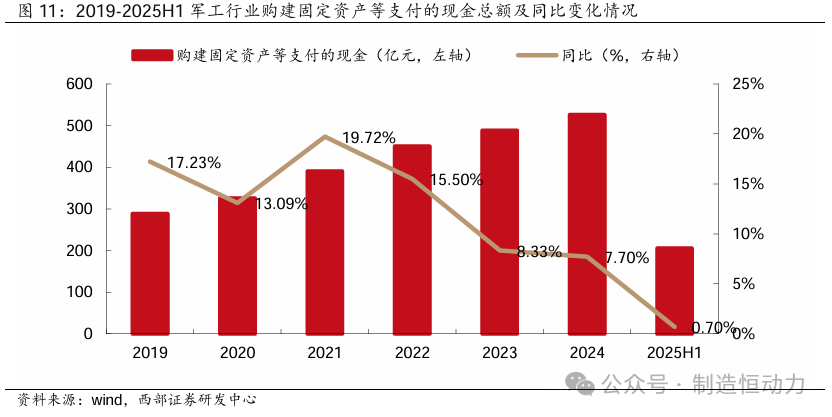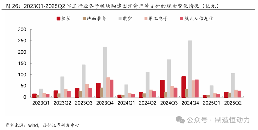 2025H1地面兵装领域稳健增加固定资产投资。2025H1,军工各行业购建固定资产等支付的现金总额同比增速:船舶+4.36%,地面装备+18.34%,航空-4.06%,军工电子-1.49%,航天及信息化+9.92%,其中地面兵装板块稳健增加固定资产投资或反映对行业未来需求的乐观预期。