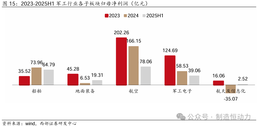 军工行业竞争格局仍处深度调整期,行业利润具有较高波动性。军工行业2025H1各细分子板块实现归母净利:船舶64.79亿元(+124.12%)、地面装备19.31亿元(+52.06%)、航空78.06亿元(-24.81%)、军工电子39.06亿元(-19.83%)、航天及信息化2.52亿元(-68.89%)。除船舶受益民品造船景气周期外,地面装备为2025H1利润端唯一同比正增长板块,且成长明显。