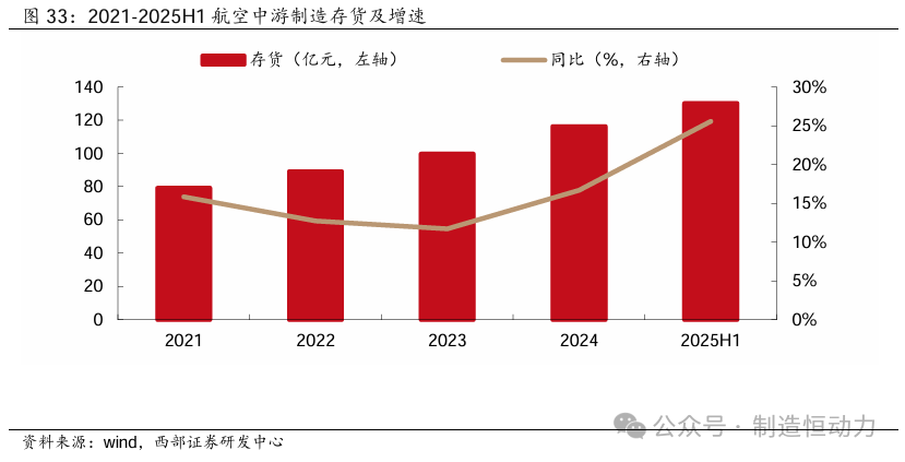 中游制造存货增长提速。截至2025H1末,航空中游制造存货130.20亿元,同比+25.56%,相较于同期整体行业存货5.35%的增速领先明显,或反映中游制造环节积极备货备产。