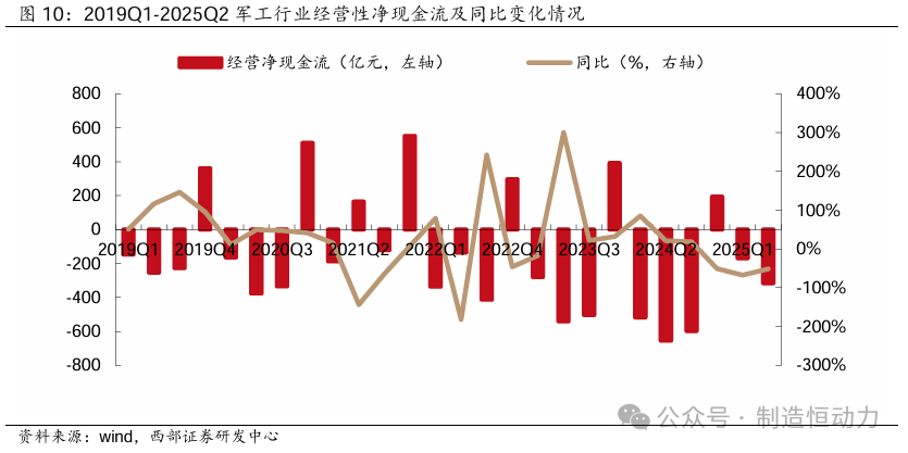 行业经营性净现金受季节性及合同波动影响。2025H1,行业经营性净现金流总额为-316.06亿元,主要系军工行业通常1-3季度都处于经营性现金净流出的状态,该数额已较2024H1的-653.74亿元好转明显。