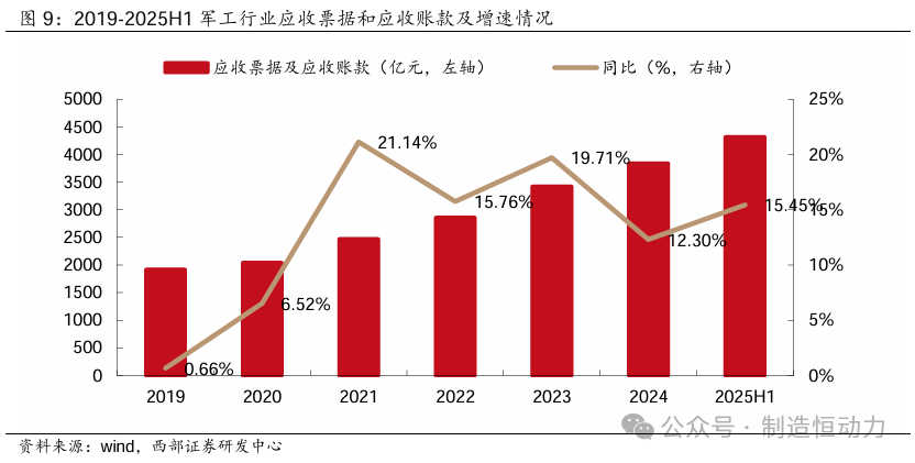 应收增长仍较为显著,行业仍应重视财务回款能力。截至2025H1末,行业应收规模4313.90亿元(同比+15.45%),行业应收增长速度高于收入增长速度,因此也对应到了行业利润表中财务费用率的提高,从而一定程度上影响企业的利润能力,目前阶段军工企业仍需重视应收的回款。