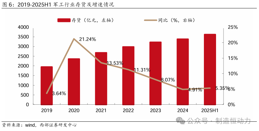 存货金额持续创新高,行业仍维持明确备产状态。截至2025H1末,军工行业的存货总额为3623.67亿元,同比增长5.35%、环比增长1.68%,从存货金额绝对值的增长可以看到行业仍进行明确的备产工作,但存货增长速率相较2020-2022年有所下降,或表明行业正在等待新一轮订单周期。