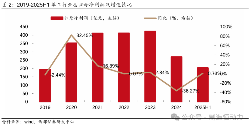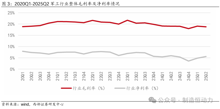2025H1军工行业实现归母净利润203.74亿元,同比增长0.73%,2025Q2单季军工行业实现归母净利润131.36亿元,同比增长7.60%。2025Q2行业归母净利于连续五个季度负增长之后,重回正增长。我们认为,军工行业此前利润端持续承压主要系装备价格调整因素所致,而此次利润端修复或表明价格影响已经集中出清,未来行业价格机制将恢复常态化调整运行。