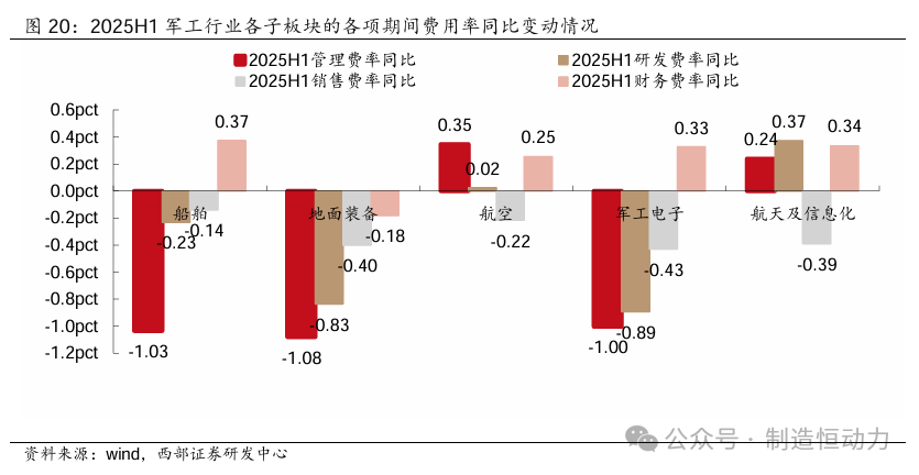 控管理费用为行业费用管控的最重要手段。复盘2025H1期间费用率同比变化情况,其中期间费用率下降明显的船舶、地面装备、军工电子行业均以管理费率的控制为主要手段,分别-1.03pct、-1.08pct、-1.00pct,并辅以研发费率及销售费率的下降。且全部行业销售费率均有所下降,也是唯一一致变化。