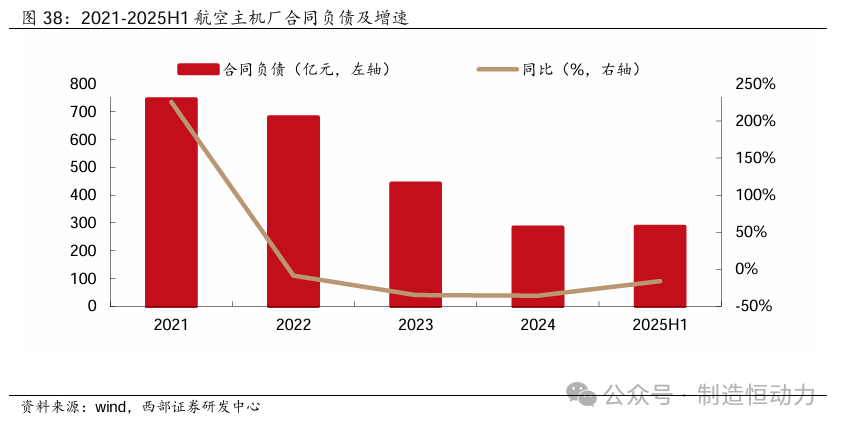 合同负债持续消化,新一轮订单周期可期。主机厂具备航空产业链“链长”地位,其合同负债水平代表着行业下游需求,也预示着行业的订单周期。截至2025H1末,航空主机厂合同负债286.11亿元,同比-16.25%、环比-17.37%。相较于2021、2022年主机厂合同负债水平,目前阶段已下滑较为明显,我们认为,或可以说明行业上一轮订单已经持续消化,新一轮订单周期可期。