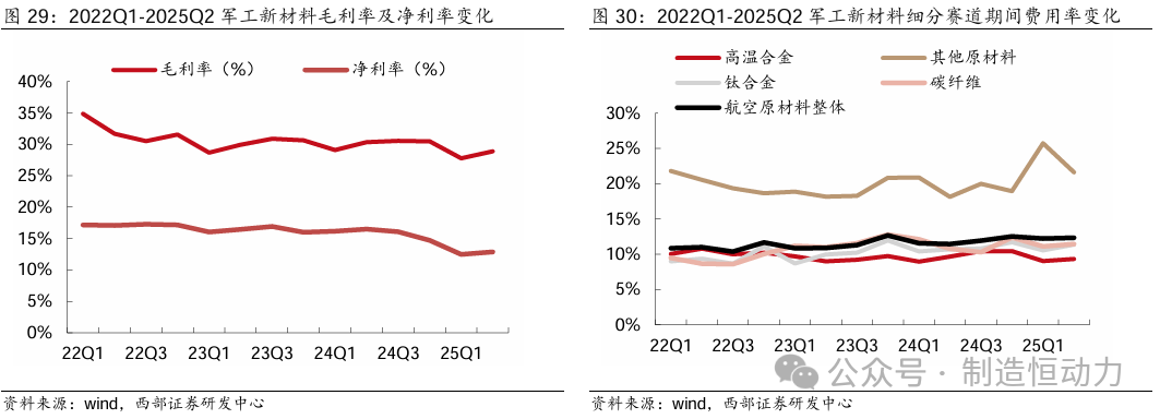 原材料环节盈利能力仍有承压。盈利能力方面,2025H1原材料环节实现毛利率28.89%(-1.45pct)、实现期间费用率12.34%(+0.88pct),实现净利率12.88%(-3.62pct)。其中高温合金环节实现净利率2.52%(-8.15pct)下降明显。