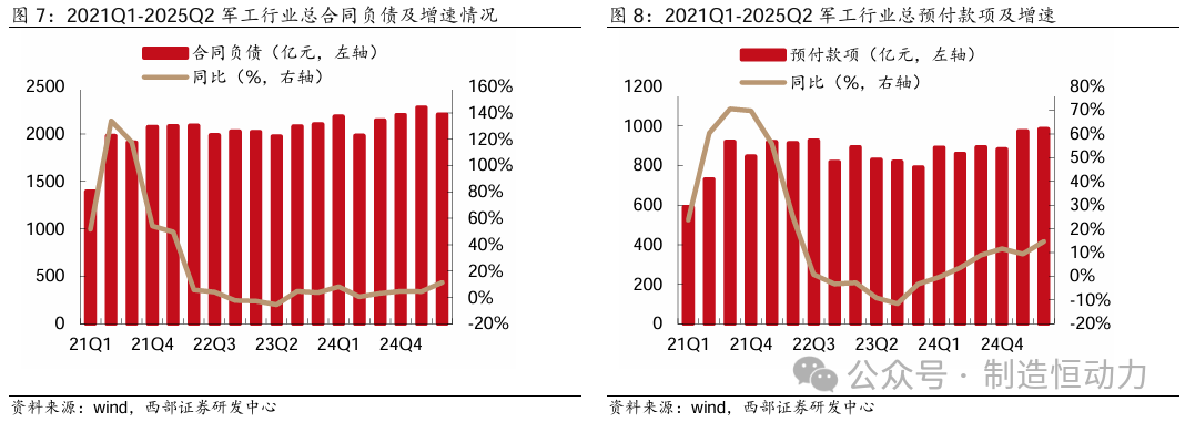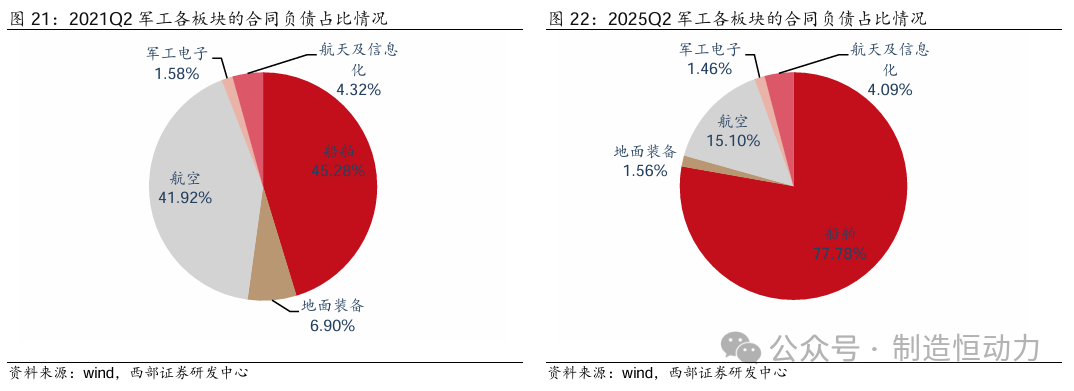航空领域经历4年合同负债消化周期后,船舶领域已构成军工行业合同负债主体。航空领域合同负债自21Q2的828.58亿元高点下降至25Q2的332.91亿元,占全行业比重由41.92%下降至15.10%,而船舶领域合同负债自21Q2的894.96亿元增长至25Q2的1714.54亿元,占全行业比重由45.28%提升至77.78%。