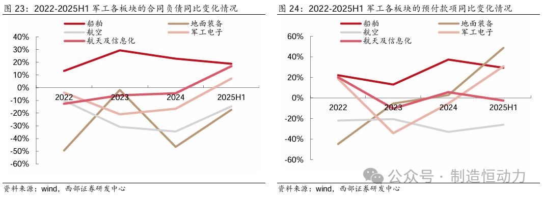 25Q2军工各板块合同负债变化情况:船舶1714.54亿元(同比+18.90%、环比-0.04%),地面装备34.43亿元(同比-17.27%、环比-26.83%),航空332.91亿元(同比-14.62%、环比-16.26%),军工电子32.29亿元(同比+7.26%、环比+4.70%),航天及信息化90.15亿元(同比+17.01%、环比+2.88%)。