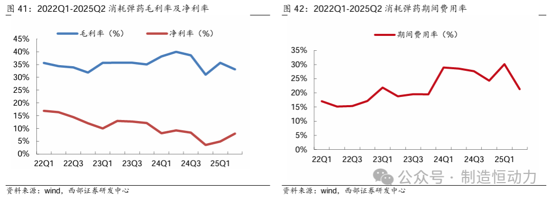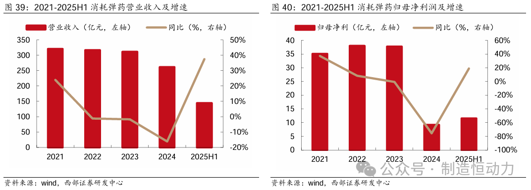 收入利润双端高增,需求明确回暖。2025H1,消耗弹药领域收入144.47亿元(+37.45%)、归母净利润11.52亿元(+19.00%)。消耗弹药领域在2024年利润端承压明显后,2025H1已成为修复改善最明显环节,行业需求恢复。
