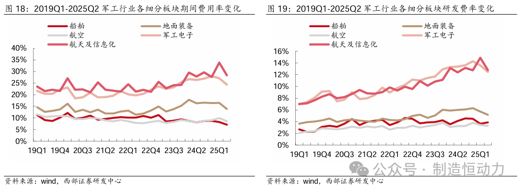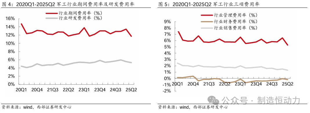 军工整体期间费用率已位于近十年最低点,提质增效进行时。2025H1,军工行业期间费用规模总额为427.57亿元,对应整体期间费用率为11.72%、同比下降0.60pct,创近十年新低。我们认为,行业利润的提升逻辑或已由高毛利支撑逐步过渡至以费用管控为主的提质增效模式,该该阶段可重视行业期间费用率变化及带来的盈利能力提升情况。