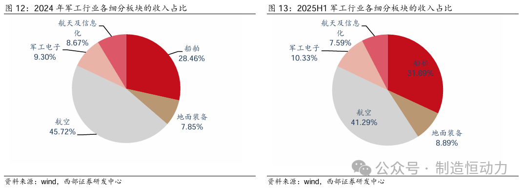 收入贡献结构:军工行业2025H1各细分子板块实现营收:航空1506.72亿元(占比41.29%),船舶1163.78亿元(占比20.45%),军工电子376.86亿元(占比10.33%),地面装备324.46亿元(占比8.89%),航天及信息化277.09亿元(占比7.59%)。25H1数据显示,整体结构变化不大,航空收入占比有所下降,地面装备收入占比已超过航天及信息化板块。