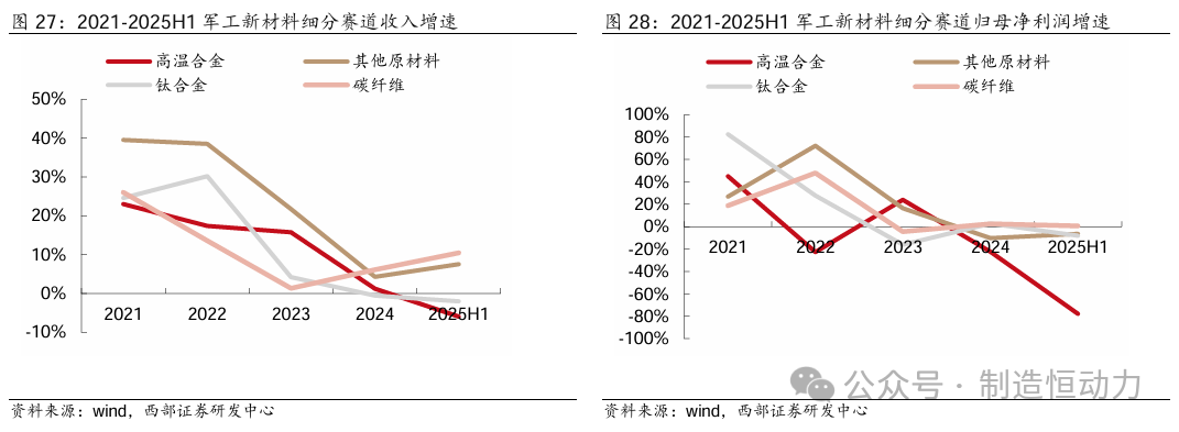 碳纤维为唯一利润正增长环节。2025H1,各原材料细分赛道收入/利润分别增速为:高温合金-5.98%/-77.79%,钛合金-2.04%/-8.01%,碳纤维10.47%/0.59%,其他原材料-5.98%/-6.43%,碳纤维为唯一收入利润双增长环节,而高温合金环节承压相对明显。