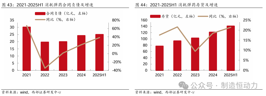 合同负债&存货增长提速,或表明消耗弹药需求端已有改善。2025H1,消耗弹药领域合同负债分别同比+38.33%,存货同比+21.43%。资产负债表前瞻性指标增长明显,或将推动消耗弹药领域成为军工行业最先恢复的细分赛道之一。