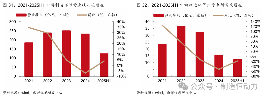 中游制造收入端回归正增长,但利润端仍相对承压。2025H1航空中游制造环节收入123.14亿元(+4.00%)、归母净利润12.17亿元(-18.08%),行业收入端已呈弱复苏态势,但由于仍受阶段性价格调整影响,利润端仍有相对承压。