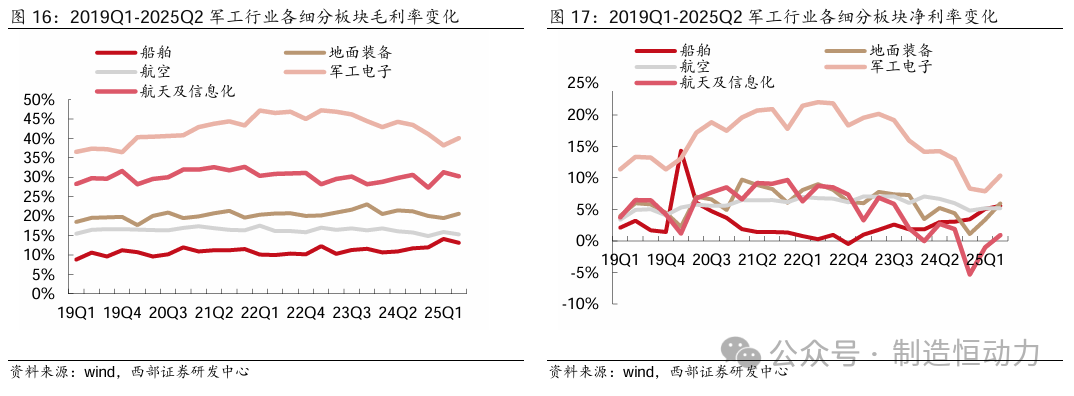 军工电子盈利能力于高位回落明显,多板块盈利能力有所调整。2025H1,军工行业各子板块毛利率:船舶13.11%(+2.19pct),地面装备20.58%(-0.90pct),航空15.30%(-0.80pct),军工电子40.07%(-4.19pct),航天及信息化30.24%(+0.45pct)。军工电子作为军工传统盈利能力最高的细分行业在本轮价格调整周期下也成为了盈利能力下滑最显著的行业,其余板块毛利率波动幅度相对较小。
