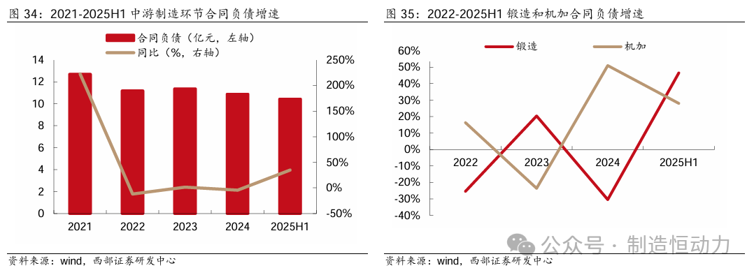 25H1中游制造环节合同负债相对增长明显。截至2025H1末,航空中游制造合同负债10.42亿元,同比+34.69%,其中机加环节同比+28.03%、锻造环节同比+46.47%,或反映中游制造的需求景气已有所恢复。