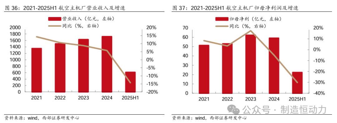 航空主机厂利润表承压明显。2025H1,航空主机厂环节收入611.57亿元(-14.26%)、归母净利润22.35亿元(-30.13%)。主机厂环节在2025H1利润端承压明显,我们认为主要系产品结构调整及交付进度所致的短期波动。