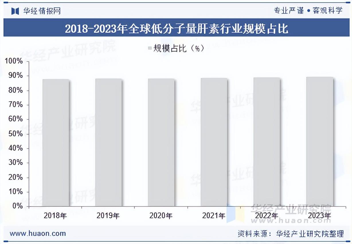 目前,大量的有关低分子肝素在抗肿瘤、抗病毒、抗炎症以及抗糖尿病相关并发症等疾病中血栓形成适应症的临床试验正在开展,低分子肝素的临床应用空间将逐渐打开。从全球低分子量肝素行业规模占比情况来看,低分子量肝素占比呈现逐年上涨态势,从2018年的87.82%上涨至2023年的89.30%。