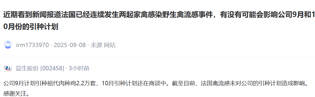 上证报中国证券网讯益生股份9日在互动平台上回答投资者提问时表示,公司9月计划引种祖代肉种鸡2.2万套,10月引种计划还在商谈中。截至目前,法国禽流感未对公司的引种计划造成影响。