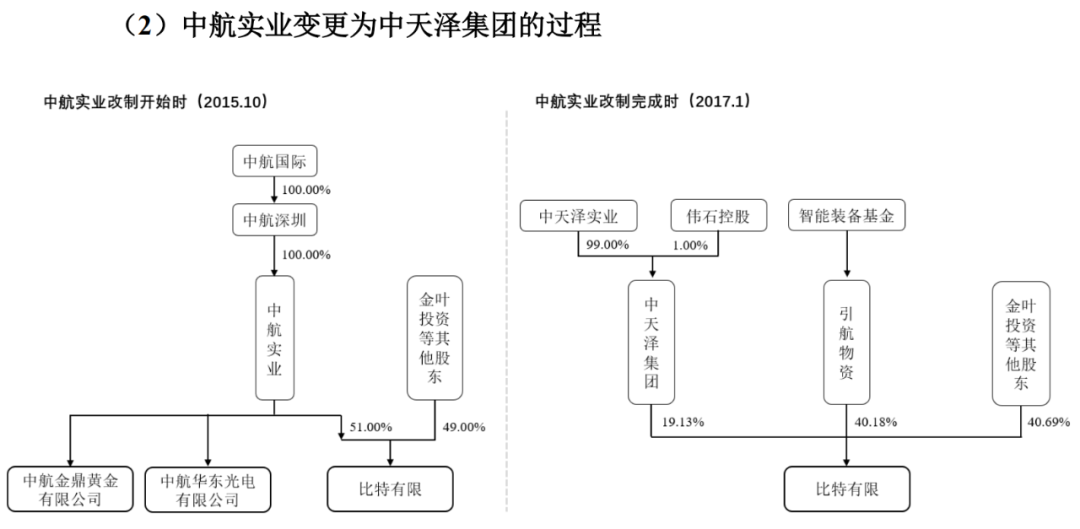 比特技术公告显示,2016年5月,比特有限作出股东会决议,增加注册资本金,引入引航物资等外部股东,中航实业对比特有限的持股比例从51%下降为19.125%,比特有限从国有资本控股公司变更为非国有资本控股公司。