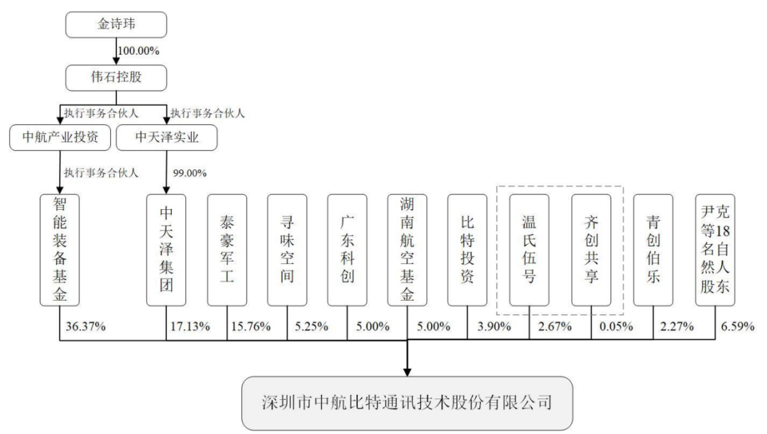 据比特技术招股书,深圳中航智能装备股权投资基金合伙企业(有限合伙)(简称“智能装备基金”)、中天泽集团分别是比特技术的第一、第二大股东,持股比例分别为36.37%、17.13%。