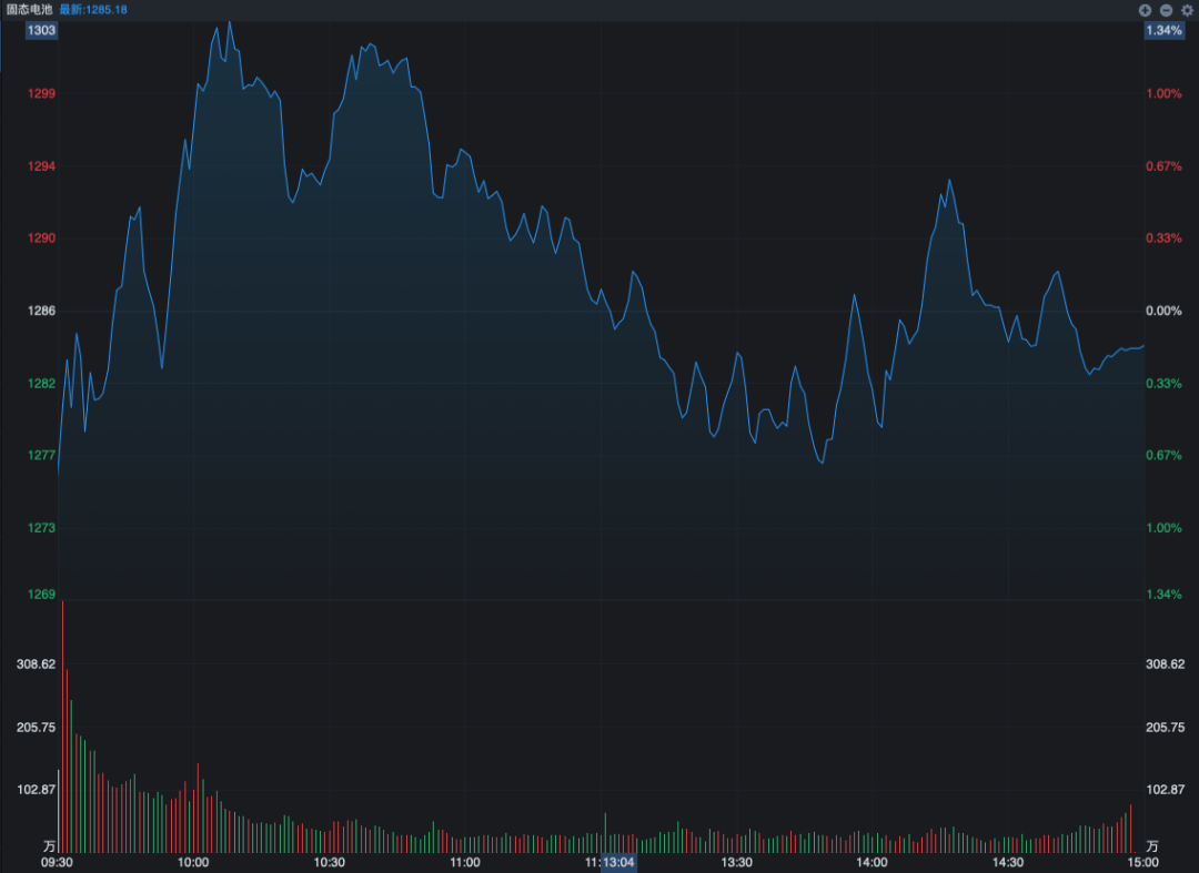 今日A股盘面上,固态电池概念股再度上扬,上海洗霸盘中创新高,天际股份4连板,泰坦股份2连板,传艺科技涨停,宁新新材、五矿新能涨幅居前,国轩高科、多氟多、南都电源等多股涨超5%,天赐材料、德赛电池、赣锋锂业等跟涨。