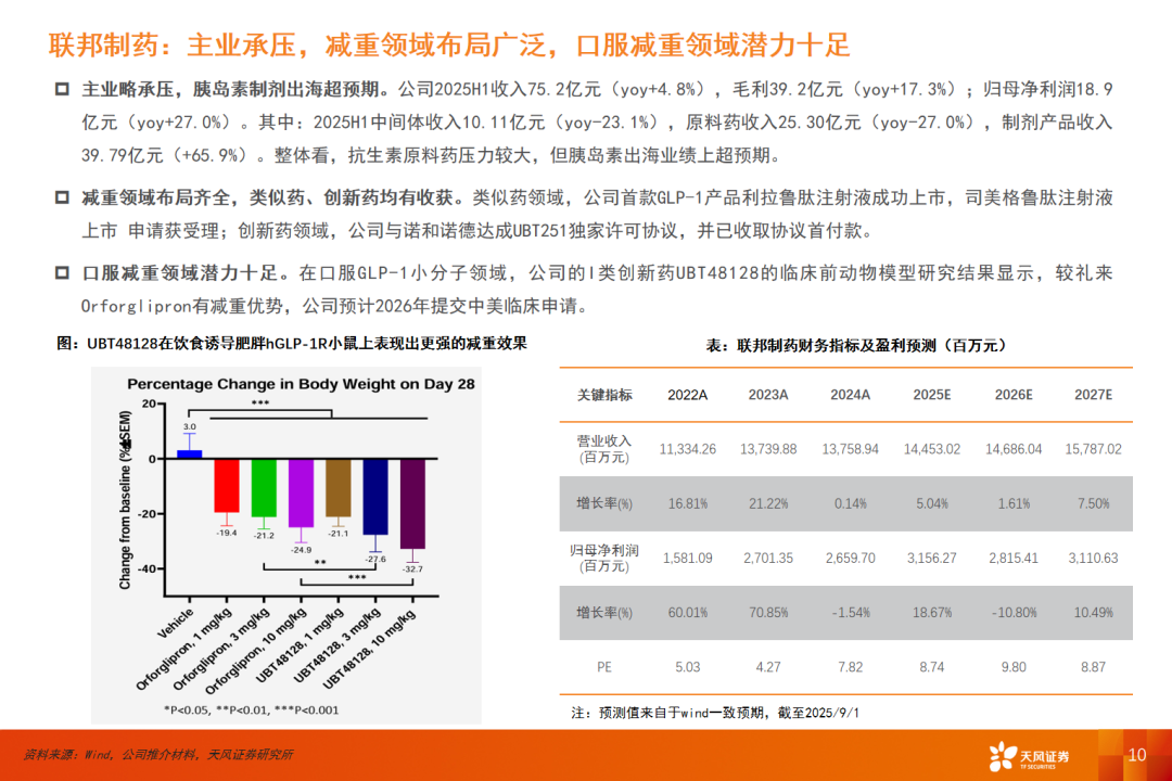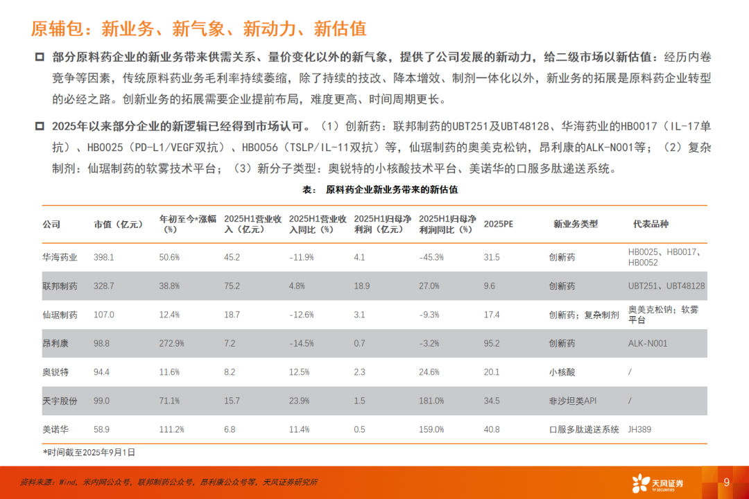经历内卷竞争等因素,传统原料药业务毛利率持续萎缩,除了持续的技改、降本增效以外,新业务的拓展是原料药企业转型的必经之路。除了制剂一体化(纵向整合产业链)以外,创新业务的拓展需要企业提前布局,难度更高、时间周期更长。2025H1,原料药企业收获期更加显著,例如:(1)创新药:联邦制药的UBT251及UBT48128、华海药业的HB0025、昂利康的ALK-N001、仙琚制药的奥美克松钠等;(2)新分子类型:奥锐特的小核酸技术平台、美诺华(维权)的口服多肽递送系统。