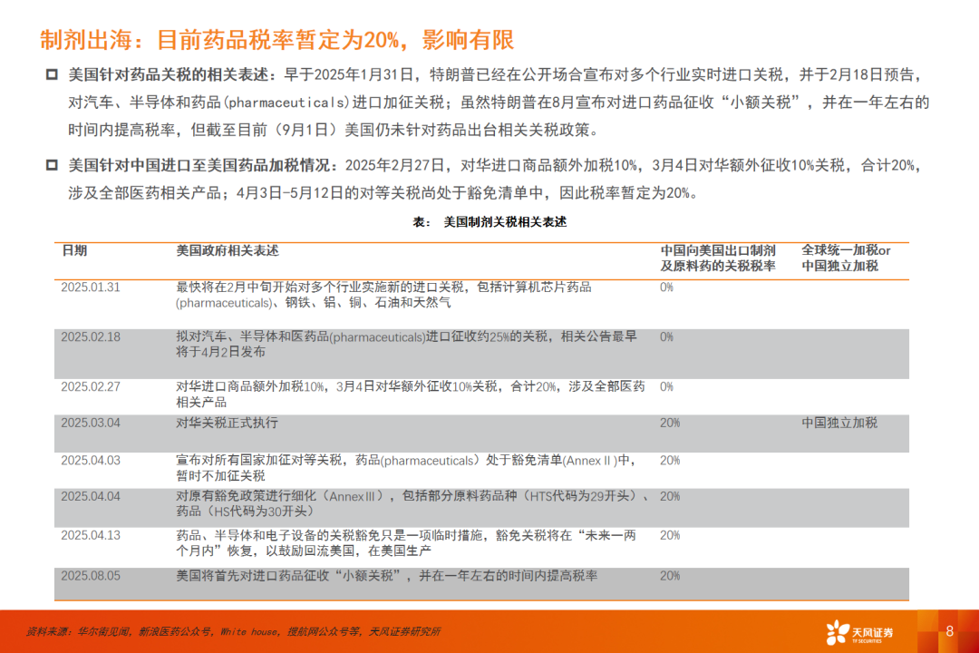 美国目前原料药关税为20%,对多数原料药企业影响有限
