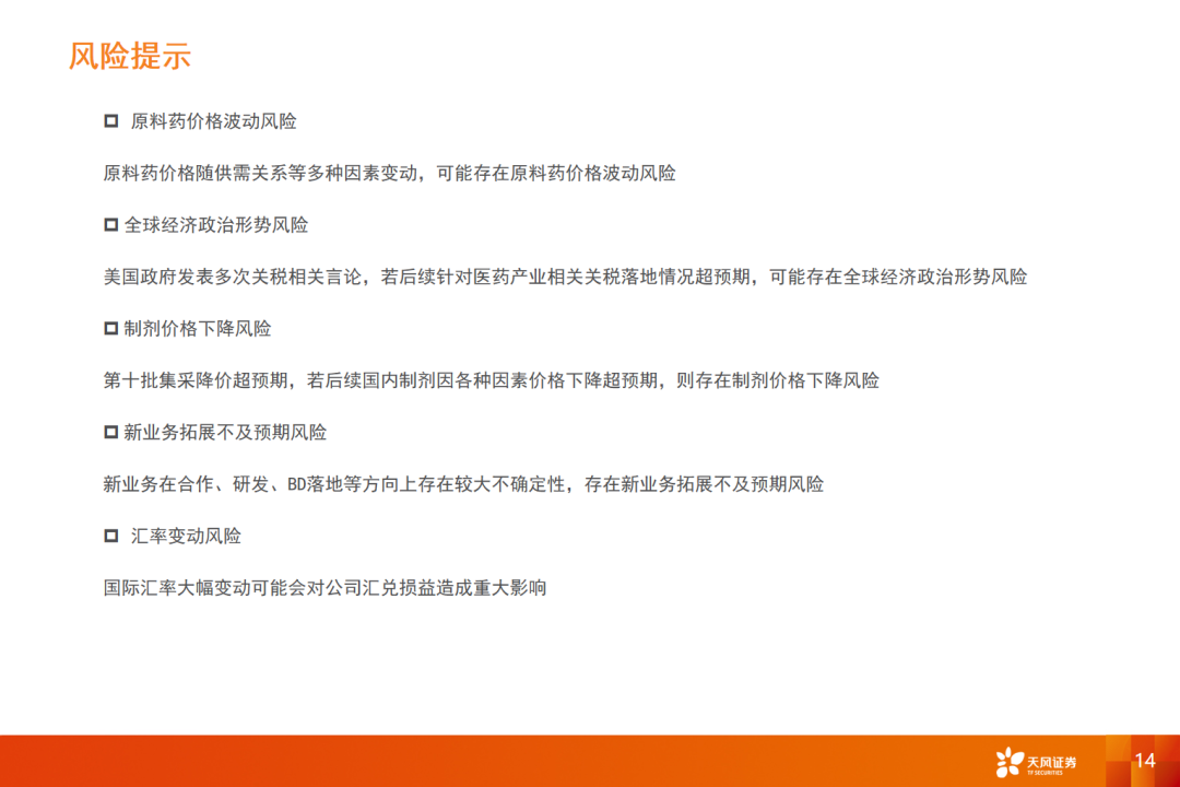 原料药价格波动风险,全球经济政治形势风险,集采制剂价格下降风险,新业务拓展不及预期风险,汇率变动风险