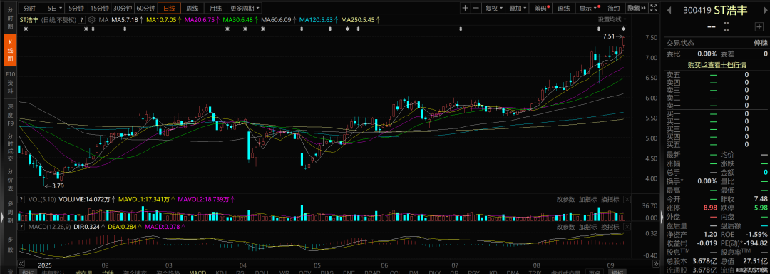 截至停牌前一交易日,即9月8日,ST浩丰盘中股价触及7.51元/股的年内新高,公司当日收涨3.46%,股价收于7.48元/股,最新总市值27.51亿元。
