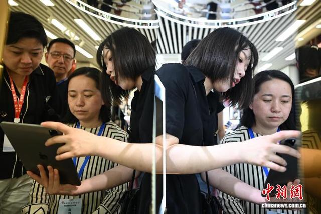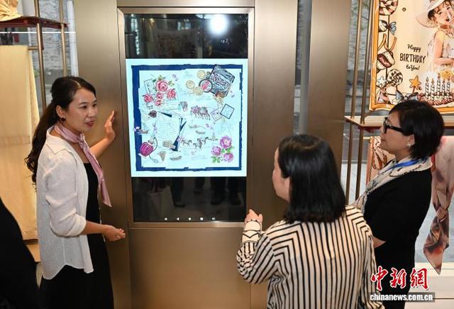 9月9日,海外华文媒体代表观看万事利丝绸的AI定制丝巾应用。当日,“让世界听见宋韵新潮声”海外华文媒体采风行在浙江杭州上城启动,来自12家海外华文媒体的代表在上城湖滨路步行街参访AI应用等。中新社记者 王刚 摄