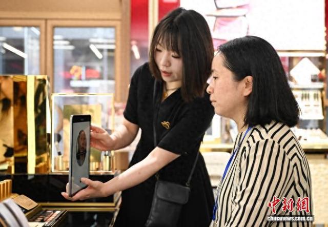 9月9日,海外华文媒体代表体验毛戈平美妆的AI试妆应用。当日,“让世界听见宋韵新潮声”海外华文媒体采风行在浙江杭州上城启动,来自12家海外华文媒体的代表在上城湖滨路步行街参访AI应用等。中新社记者 王刚 摄