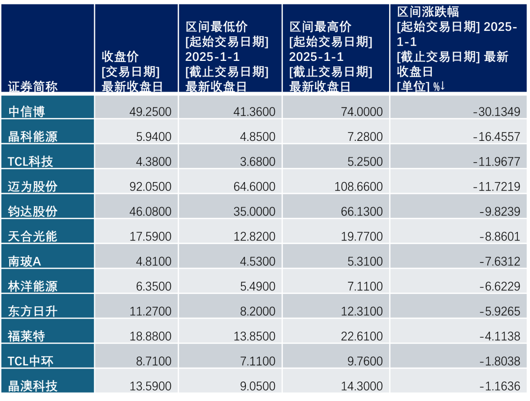 截至今日收盘,只有12只光伏概念股的股价不及2025年1月1日。这些公司以主材企业、电站企业为主。他们的股价表现都与业绩有关,主材企业亏损严重;电站企业也普遍受到了136号文等影响,资产价值面临重估。