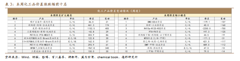 本周化工品价差跌幅前十名为:DMC-EO 法价差(-107 元/吨)、苯酐-工业萘价差(-160 元/吨)、R410a-R125-R32 价差(-750 元/吨)、PTA-PX 价差(-125元/吨)、丙烯酸丁酯-丙烯酸-正丁醇价差(-19 元/吨)、MTO 价差(乙烯-甲醇)(-31 元/吨)、苯乙烯-纯苯-乙烯价差(-117 元/吨)、DMF-甲醇-液氨价差(-112 元
