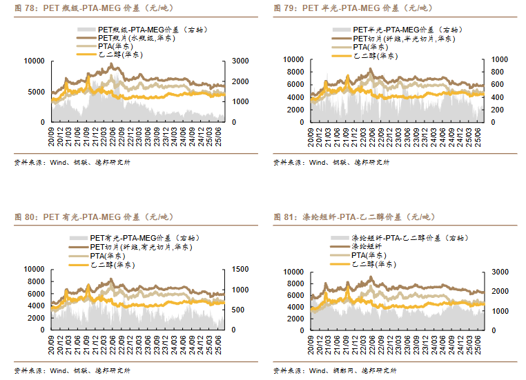 目投产、供给增加影响,2024 年,聚酯瓶片产销量延续增长态势,但市场整体呈现“量增价减”特征,行业平均加工费较 2023 年下降 30%以上,企业利润普遍受到挤压。为应对内卷竞争,据百川盈孚,截至 2025 年 9 月 5 日,重庆万凯一条 30万吨/年产线减停;浙江万凯新材料 25 万吨/年产线转回切片;辽阳石化 10 万吨/年产线长期转产膜片;逸盛大化 35 万吨/年产线于 9 月 1 日停车检修、三房巷近期停小线一条,涉及产能 20 万吨/年;仪征化纤 15 万吨/年产线转回切片;华润化学、华润江阴工厂、珠海华润合计 330 万吨/年产线于 6 月 22 日开始减产,涉及总产能的 20%;宝生聚酯 15 万吨/年产线因环保检查停车;海南逸盛部分减产设备重启,但仍有 75 万吨/年产能恢复时间待定;安阳化学 30 万吨/年产能停车检修,重启时间推迟;福建百宏一套装置停车,涉及产能 35 万吨/年。当前行业共有约 356万吨瓶片产能处于或将处于停减转产状态,截至 2025 年 8 月,我国聚酯瓶片产能共计约 2133 万吨,停减转产产能占总产能的比例约为 16.7%。考虑到 9 月减产力度仍存,我们预计行业自律倡议下,协同力度有望再加强,供给端或延续有效收缩,产业链利润有望修复。建议关注:万凯新材、恒逸石化、华润材料、三房巷等。