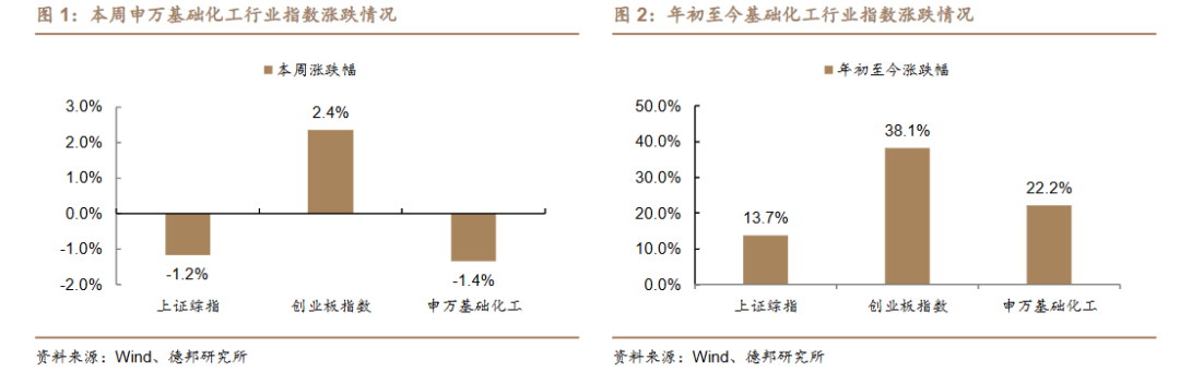 本周基础化工板块表现好于大盘。根据 Wind,本周(8/30-9/5)上证综指涨跌幅为-1.2%,创业板指数涨跌幅为+2.4%;申万基础化工行业指数涨跌幅为-1.4%,在全部 31 个行业板块中位列第 20 位,跑输上证综指 0.2 个百分点,跑输创业板指数3.7 个百分点。年初至今,上证综指涨跌幅为+13.7%,创业板指数涨跌幅为+38.1%;申万基础化工行业指数涨跌幅为+22.2%,跑赢上证综指 8.5 个百分点,跑输创业板指数 15.9 个百分点。