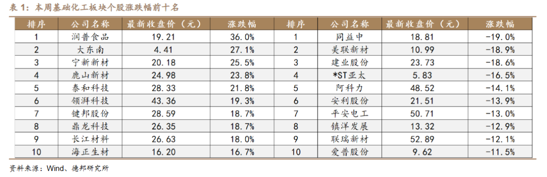 在基础化工板块 424 只股票中,本周 160 只股票上涨,262 只股票下跌,2只股票持平。本周个股涨幅前十名分别为:润普食品(+36.0%)、大东南(+27.1%)、宁新新材(+25.5%)、鹿山新材(+23.8%)、泰和科技(+21.8%)、领湃科技(+19.3%)、键邦股份(+18.7%)、鼎龙科技(+18.7%)、长江材料(+18.0%)、海正生材(+16.7%)。本周个股跌幅前十名分别为:同益中(-19.0%)、美联新材(-18.9%)、建业股份(-18.6%)、*ST 亚太(-16.5%)、阿科力(-14.1%)、安利股份(-13.9%)、平安电工(-13.0%)、镇洋发展(-12.9%)、联瑞新材(-12.1%)、爱普股份(-11.5%)。