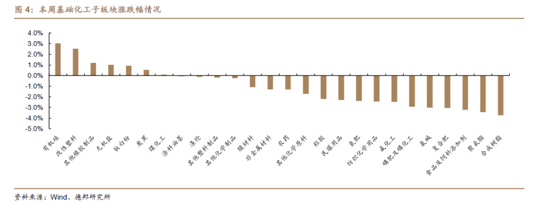 细分板块看,在基础化工 26 个子板块中,7 个子板块上涨,19 个子板块下跌。本周子版块涨跌幅前五名分别为:有机硅(+3.1%)、改性塑料(+2.5%)、其他橡胶制品(+1.2%)、无机盐(+1.0%)、钛白粉(+0.9%);本周子版块涨跌幅后五名分别为:合成树脂(-3.7%)、聚氨酯(-3.4%)、食品及饲料添加剂(-3.2%)、复合肥(-3.1%)、氯碱(-3.0%)。
