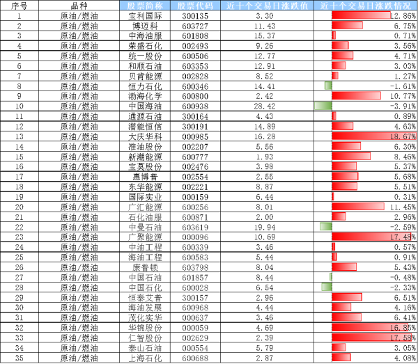 原油关联个股:宝利国际(300135)、博迈科(603727)、中海油服(601808)、荣盛石化(维权)(002493)、香梨股份(600506)、和顺石油(603353)、贝肯能源(002828)、恒力石化(600346)、渤海化学(600800)、中国海油(600938)、通源石油(300164)、潜能恒信(300191)、大庆华科(维权)(000985)、准油股份(002207)、新潮能源(600777)、宝莫股份(002476)、惠博普(002554)、东华能源(002221)、国际实业(000159)、广汇能源(600256)、石化油服(600871)、中曼石油(603619)、广聚能源(000096)、中油工程(600339)、海油工程(600583)、康普顿(603798)、中国石油(601857)、中国石化(600028)、恒泰艾普(300157)、海油发展(600968)、茂化实华(000637)、华锦股份(000059)、仁智股份(维权)(002629)