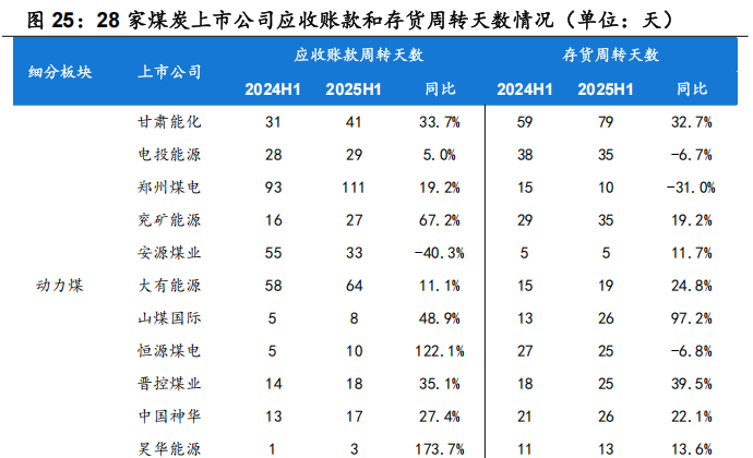 应收账款方面,2025年上半年28家煤炭上市公司应收账款周转天数同比上涨,回款能力有所走弱,2025年上半年28家煤炭上市公司应收账款周转天数平均为31天,同比增长6天,同比上涨21.8%;存货周转方面,存货周转天数28天,同比上涨27.1%。