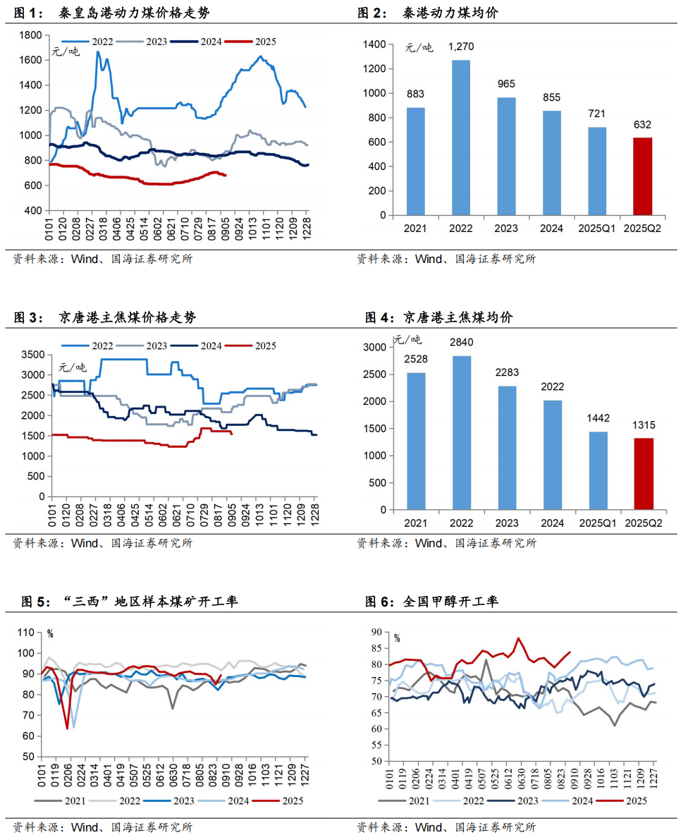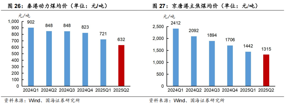 2025Q2煤价同比回调,当前处于磨底阶段。分煤种以及均价水平来看,2025Q2秦港动力煤(Q5500,山西产)均价为632元/吨,同比-25.56%;2025Q2京唐港主焦煤(山西产)均价为1315元/吨,同比-37.13%。当前价格已明显回升,港口动力煤三季度均价665元/吨(截至9月9日),港口焦煤二季度均价在1534元/吨(截至9月9日)。