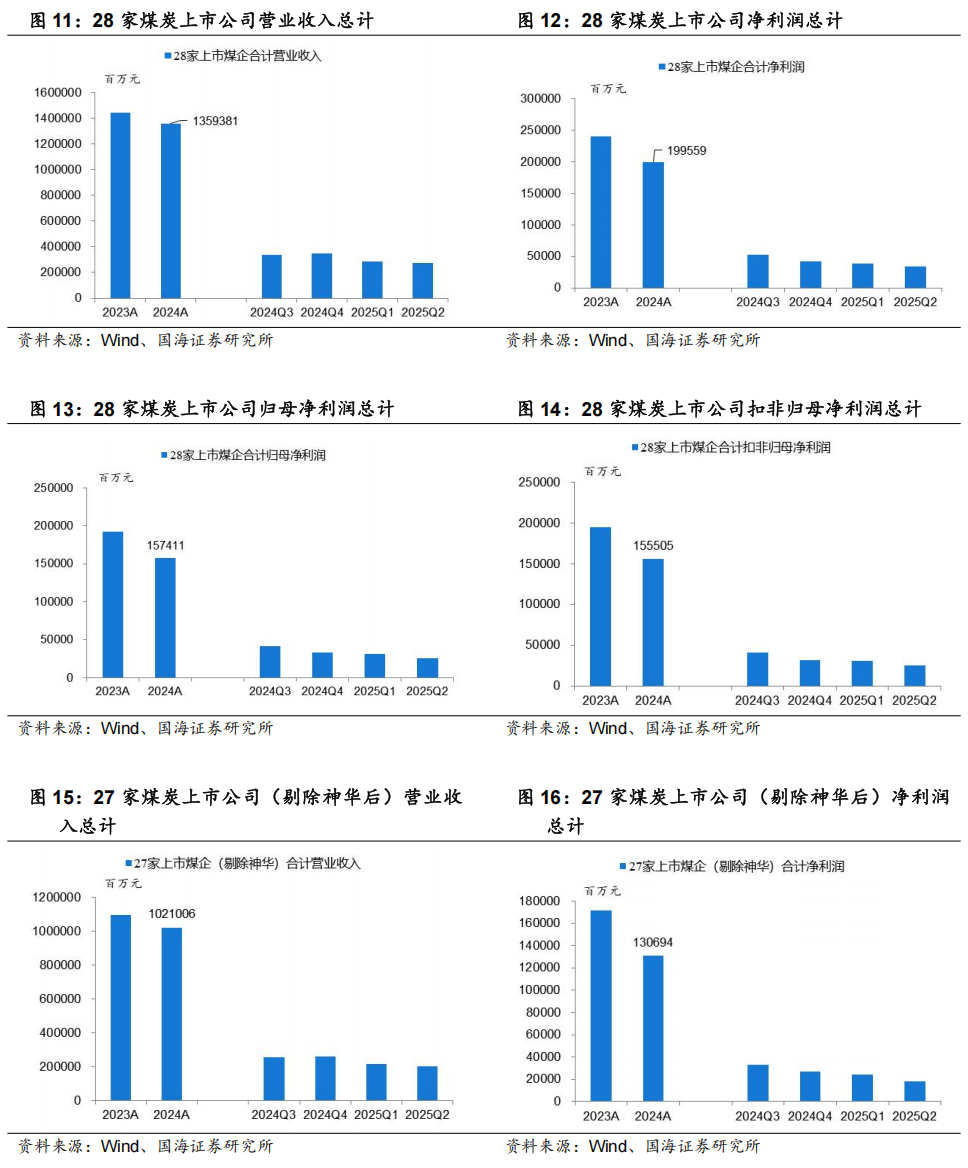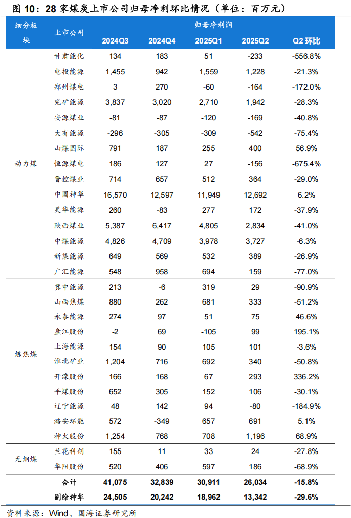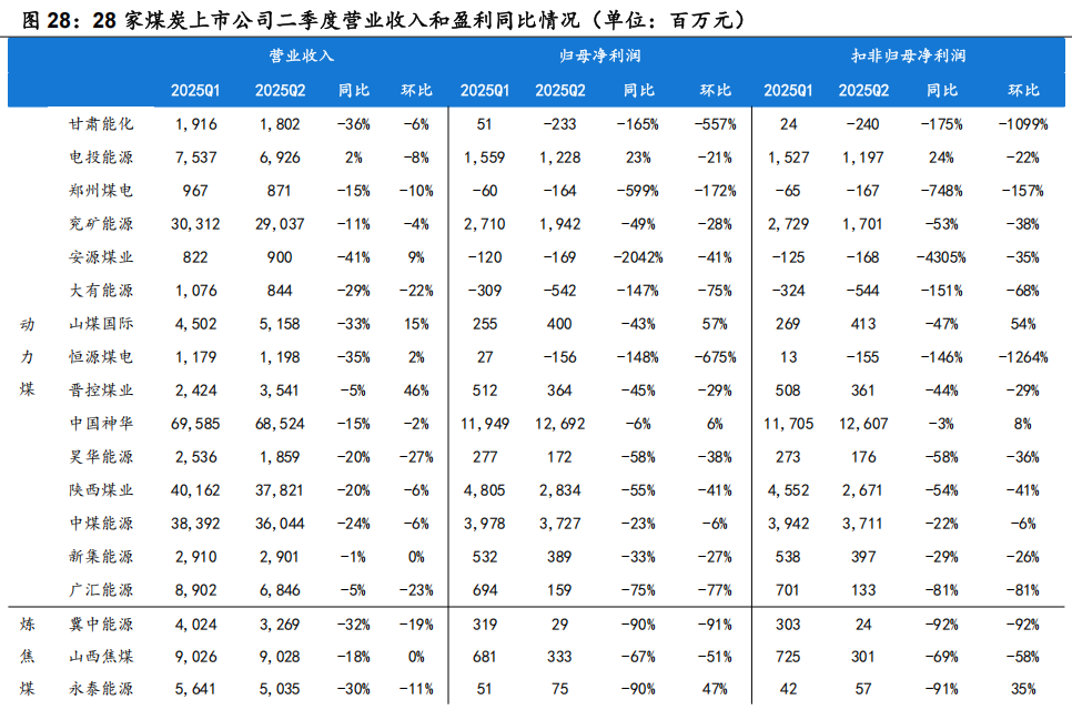 我们重点关注的28家煤炭上市公司,2025Q2年合计实现营业收入2712.10亿元,同比-19%,环比-4%;合计实现归属母公司净利润260.34亿元,同比-35%,环比-16%;合计实现扣非后归属母公司净利润250.57亿元,同比-36%,环比-18%。如果剔除对行业影响较大的中国神华,27家煤炭上市公司,2025Q2合计实现归属母公司净利润133.42亿元,同比-49%,环比-30%,业绩同比下降主要是由于煤价下跌所致。