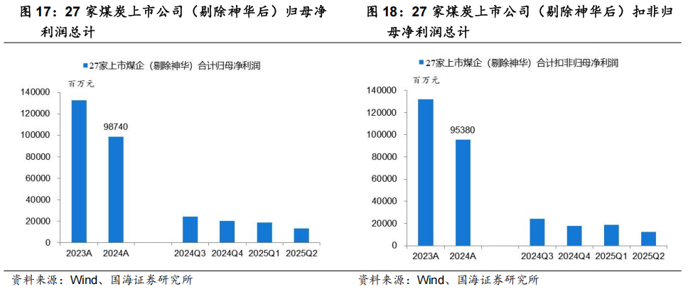 2025Q2单季业绩环比下滑,亦与煤价环比下滑有关。2024年三季度、四季度与2025年一季度28家煤炭上市公司归母净利润分别为410.75亿元、328.39亿元和309.11亿元,2025年二季度业绩为260.34亿元,环比-15.8%。如果剔除中国神华后,剩余27家煤炭上市公司,2024年三季度、四季度与2025年一季度归母净利润分别为245.05亿元、202.42亿元和189.62亿元,2025年二季度业绩为133.42亿元,环比-29.6%。